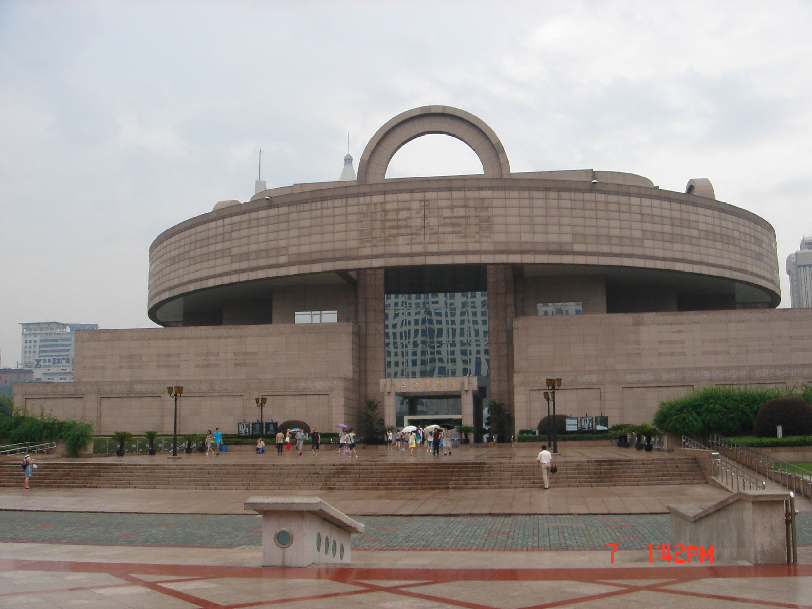 博物館最早的館址是南京路上的上海圖書館,1935年建館,七年后,搬到河南南路的中匯銀行大廈。新館位于市中心人民廣場 南端,占地面積33畝。地下二層,地上五層,地面高度29米,總投資為43億元。于1993年9月開工,1994年9月完成主體結(jié)構(gòu)和外墻貼面裝飾,1995年底正式開館。是一座方體基座與圓形出挑相結(jié)合的建筑,造型具有中國“天圓地方”的寓意。它既有中國傳統(tǒng)建筑之基座、臺階的形意,有園林綠化的東方格調(diào),體現(xiàn)了現(xiàn)代科技和時代精神。從遠處眺望博物館,圓形屋頂加上拱門的上部弧線,整座建筑猶如一尊中國古代青銅器;若從高處俯視博物館,則屋頂平面猶如一面巨大的漢代規(guī)矩鏡的圖案。到了晚上,中間圓頂13米跨度的玻璃采光球,在泛光燈照用下,更似一顆熠熠生輝的夜明珠。博物館有四座高聳的藝術(shù)雕刻 拱門,記錄文字和歷史演變的進程;右面門前兩側(cè)8只獅子和天祿的藝術(shù)石雕,表達了中國文化的無比璀璨。