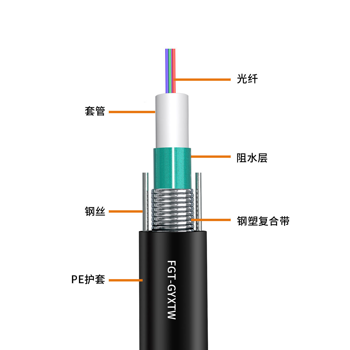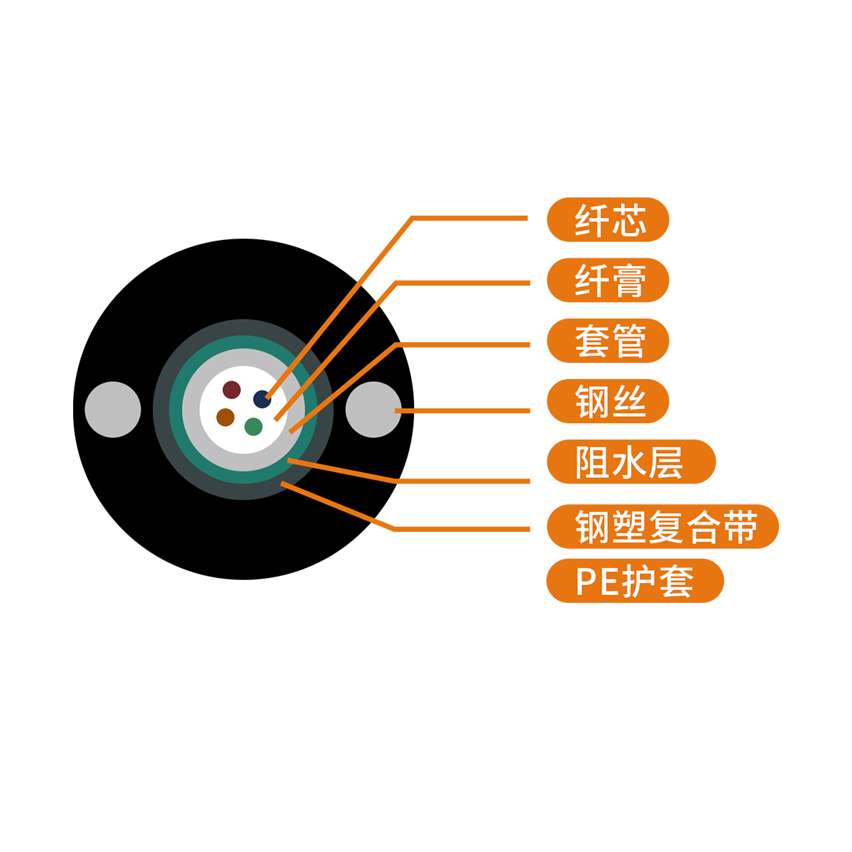 兩根平行鋼絲保證光纜的抗拉強度,直徑小、重量輕、容易敷設(shè)
