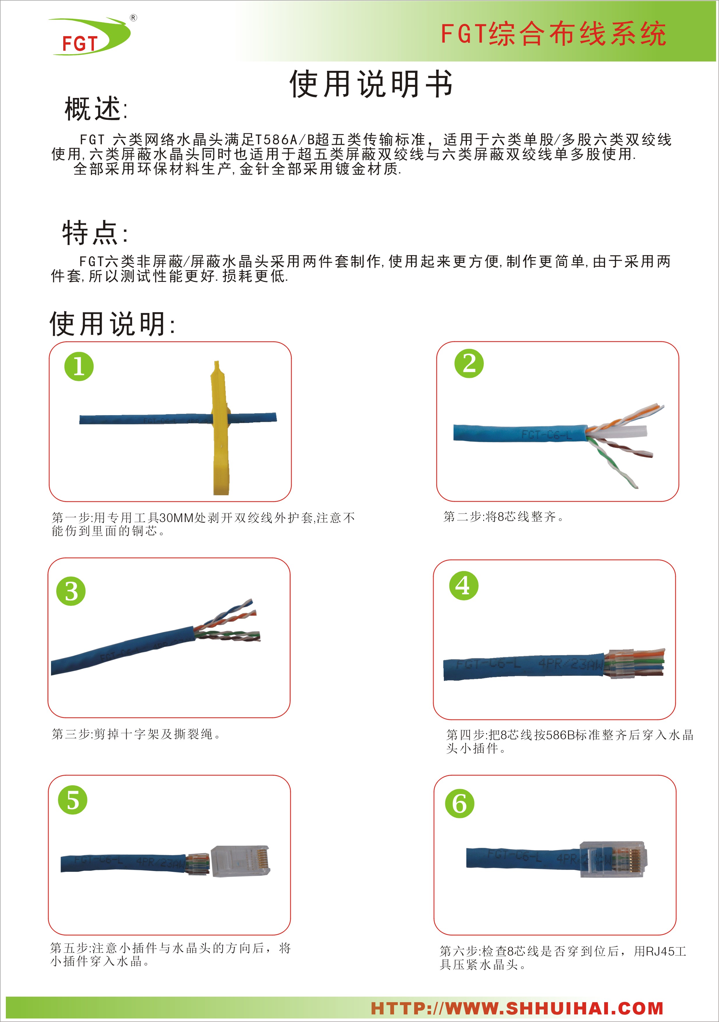 FGT備有4芯電話水晶頭,超五類、六類、超六類非屏蔽與屏蔽水晶頭可供選擇。